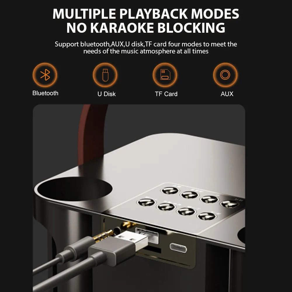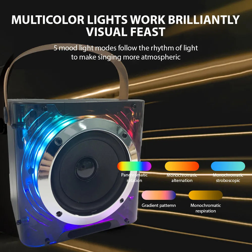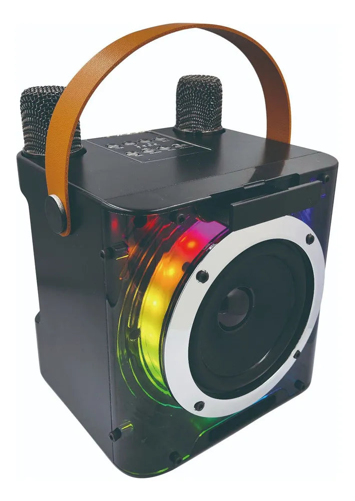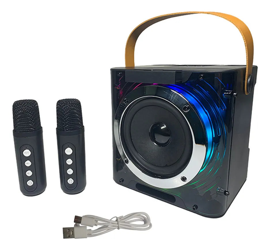 Convierte cualquier lugar en tu escenario con esta Mini Karaoke Machine con 2 micrófonos inalámbricos y conexión Bluetooth. Su diseño compacto y moderno con luces LED multicolores hará brillar cada nota. ¡Ideal para cantar, compartir y disfrutar en familia o con amigos!